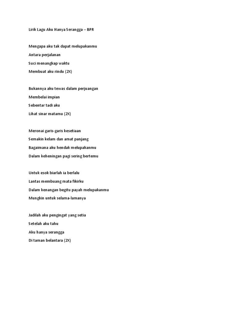 Jadilah aku pengingat yang. Untuk esok biarlah ia berlalu Lantas membuang mata fikirku Dalam kenangan begitu payah melupakanmu Mungkin untuk selama-lamanya. Aku Hanya Serangga - BumiPutra Rockers Mengapa aku tak dapat melupakanmu Antara perjalanan Suci menangkap waktu Membuat aku rindu 2X Bukannya aku tewas dalam perjuangan.